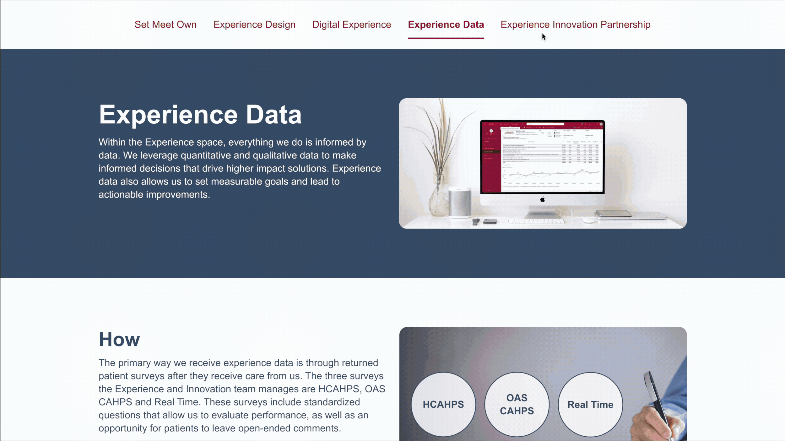 Experience doesn’t just mean how we interact with each other a the hospital, but also how we engage with our community. While developing the Experience Hub, we thought to include all the things we do in the digital environment, partnerships with our communities, and showing our teams how to use data to drive and influence impact. With these new additions, we had multiple design sessions with our Innovation and Marketing teams to help showcase their assets and resources.